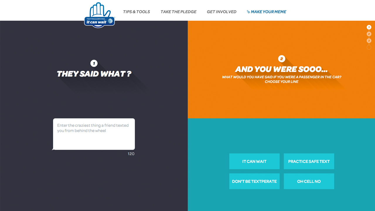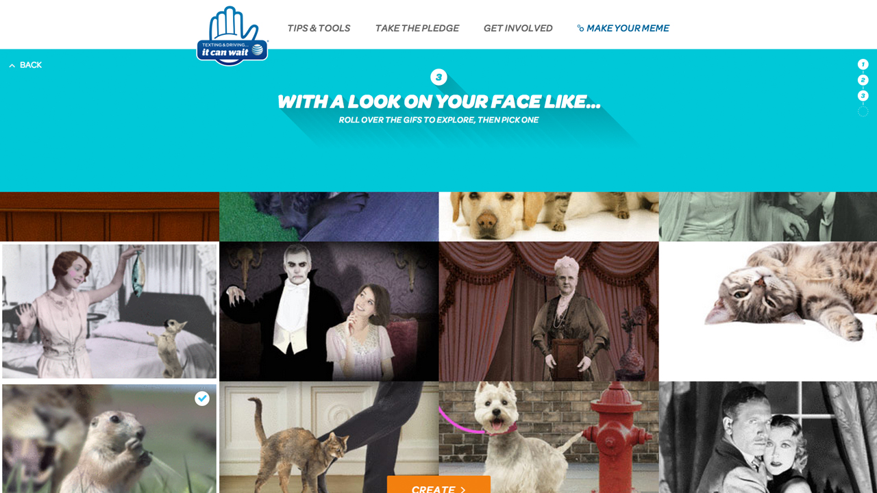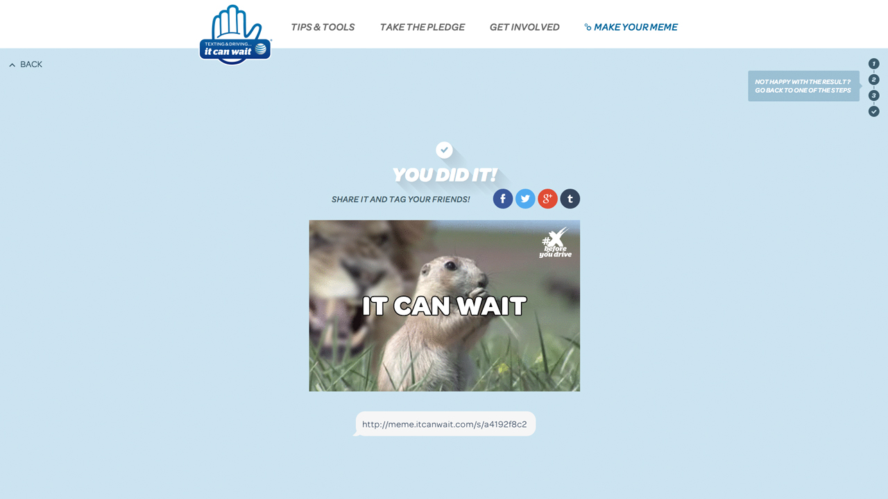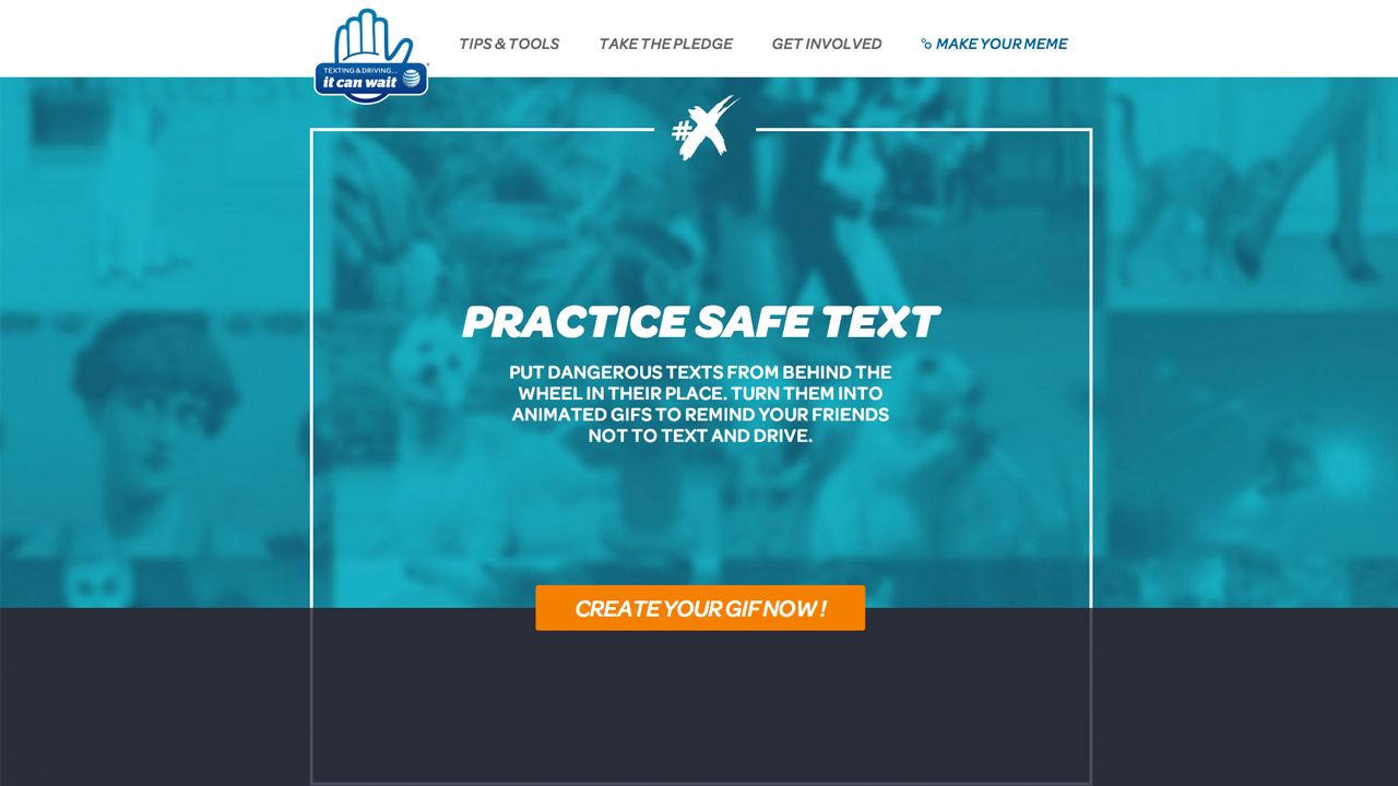 Under the banner “Practice Safe Text,” this easy to use tool encourages young people to “put dangerous texts from behind the wheel in their place” by transforming them into animated gifs. Users then send these self-made creations to friends as a fun yet serious way to remind them not to text and drive. Users are also provided with an opportunity to get further involved in the cause and to join the It Can Wait community by taking a pledge to stop texting & driving—a pledge that nearly 6 million people have made thus far.